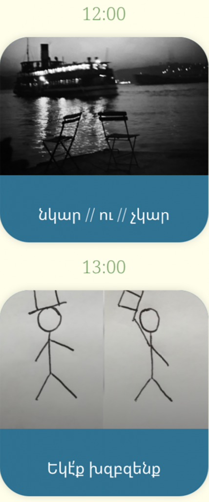 Յետոյ, կը սկսին աշխատանոցները, որոնց անուանումն ու բովանդակութիւնը ինքնորոյն են, մանուկներու երեւակայութեամբ կնքուած՝ «համով-հոտով», «Չափագիտաստան», «նկար // ու // չկար», «Եկէ՛ք խզբզենք», «կրկնանկար», «մարդագայլ»…