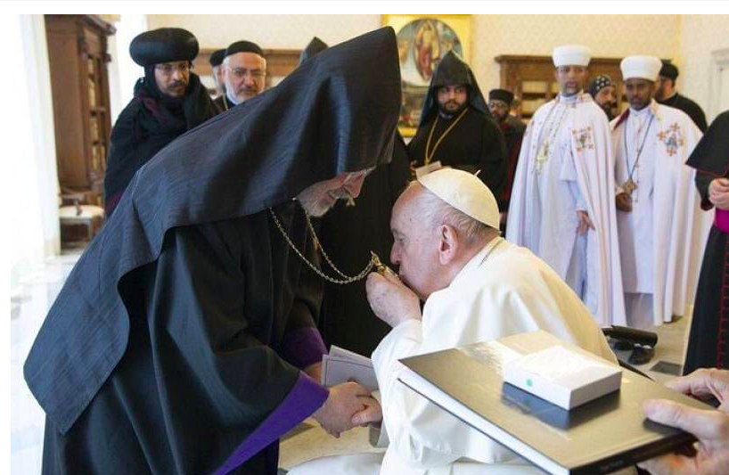 «Հիանալի լուսանկար է Վատիկանի ուղղափառ հոգեւորականներու եւ վանականներու հանդիպումէն. Հռոմի պապը կը համբուրէ Հայ Առաքելական եկեղեցւոյ սրբազան կախազարդը՝ ողջունելով հայ հիւրերը»: