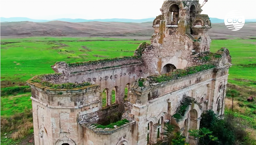 Ուրեմն, վերադառնանք պատմական այս առաջին կոթողին. ան կը ներկայացուի որպէս ռուս ուղղափառ Սուրբ Վերափոխման տաճար, կառուցուած 1894-ին (որուն հիմնադրութեան համար, ի դէպ, տեսանիւթին մէջ աւելի վերջ կատարուած անդրադարձին՝ տարբեր թուականներ կը վերագրուին), զոր Հայերը «բռնագրաւման տարիներուն ամբողջովին աւերած են, պատերը փլցուցած. միայն ճակատի մասը մնացած է։ Հայերը, շինութիւնը քար առ քար քանդած են»։