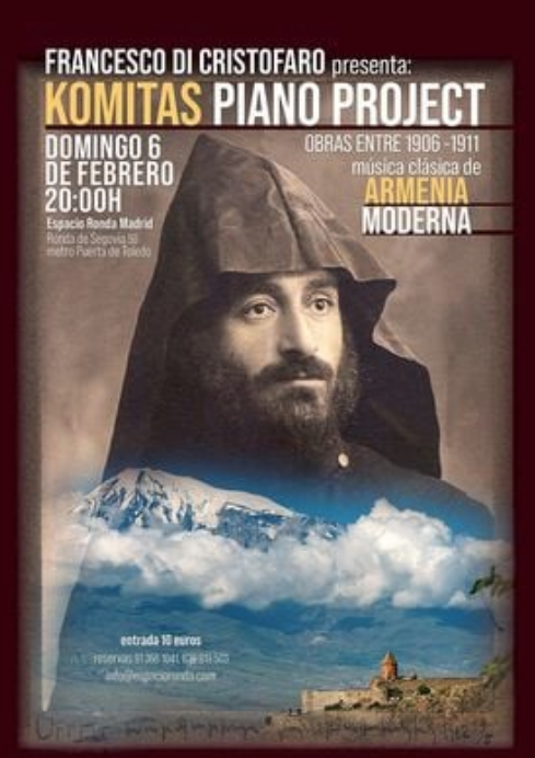 Փետրուար 6-ին, Մատրիտի Espacio Ronda-ին մէջ տեղի կ՚ունենայ Komitas Piano Project համերգային երեկոյթը, որու ընթացքին իտալացի դաշնակահար և աքորտէոնահար Ֆրանչեսքօ Տի Քրիսթոֆարոյի կատարողութեամբ կը ներկայացուին Կոմիտաս Վարդապետի՝ 1906-1911-ին յօրինած ստեղծագործութիւնները։ Լուրը հաղորդած է Սպանիոյ մէջ ՀՀ դեսպանութիւնը։