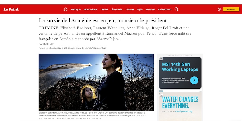Ֆրանսական հեղինակաւոր շաբաթաթերթ « Le Point » Երեքշաբթի, Յունիս 18-ին իր կայքէջի գլխաւոր լուրի բաժնին մէջ հրապարակած է ֆրանսացի 120 անձնաւորութիւններու՝ նախագահ Մաքրոնին յղած կոչը, ուր կը պահանջուի ֆրանսական զօրաբաժին մը ղրկել Հայաստան, որու գոյութեան վտանգ կը սպառնայ։ Նախաձեռնութիւնը կու գայ Ֆրանսահայ կազմակերպութիւնները համակարգող խորհուրդէն՝ CCAF-էն։ Կոչին միացած են մեծ թիւով քաղաքական բարձրաստիճան դէմքեր, ծանօթ արուեստագէտներ, մտաւորականներ, գիտնականներ … Յիշենք մի քանին՝ Անն Հիտալկօ, Էլիզապէթ Պատանթէր, Պերնար Քուշնէր, Զաւիէ Պերթրան, Լոռան Վոքիէզ, Էրիք Սիոթի, Պերնար-Հանրի Լեւի, Ֆրանսուա-Զաւիէ Պելամի, Պրիւնօ Լը Ռու, Ռոպէր Կէտիկեան, Սիմոն Աբգարեան եւ տասնեակ ուրիշներ։ ■