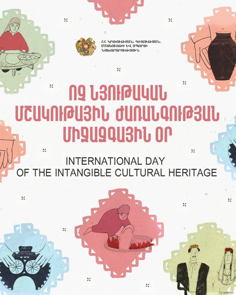 Conformément à l’esprit de cette journée, diverses manifestations culturelles auront lieu dans les communautés : expositions, spectacles, master classes, événements de danse et de musique, dont le but est de mettre en valeur les éléments du patrimoine culturel immatériel inscrits sur les listes de l’État arménien et de l’UNESCO.