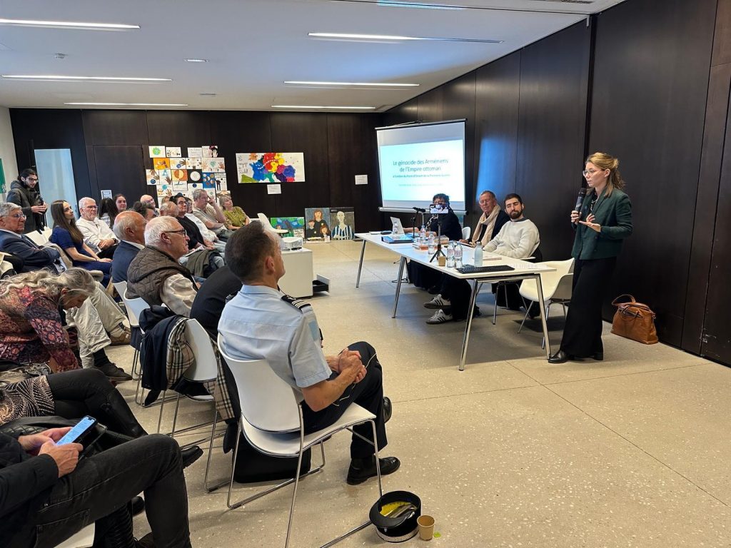 Parmi les trois conférenciers, la première à prendre la parole fut Mme Claire Mouradian, directrice de recherche émérite au CNRS, CERCEC, associée au Centre de recherches historiques, qui a essentiellement parlé du contexte du génocide des Arméniens. Puis, M. Jean Cordelle, petit-fils d’un jeune officier de marine servant sur le Desaix, auteur de « L’épopée des Arméniens et des Marins », a pris la suite pour relater l’épopée du Musa Dagh dans le contexte du génocide. Enfin, M. Raphaël Vartanian, doctorant en histoire et enseignant, a clôturé la conférence en faisant le lien historique entre cette épopée et la création de la Légion d’Orient.