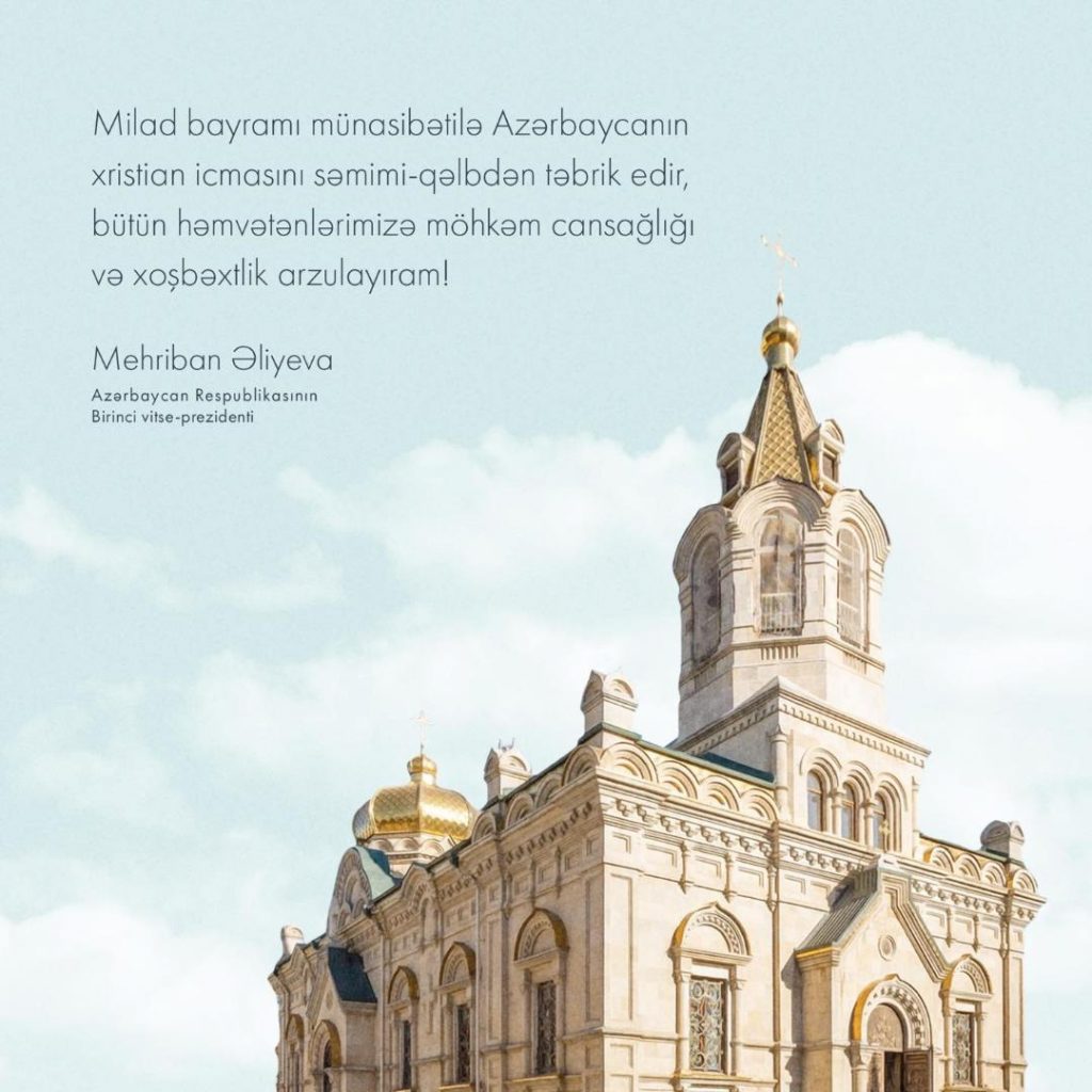 Le 5 janvier, le site officiel d’Ilham Aliev a publié son message de félicitations à l’occasion de la fête de Noël. Contrairement aux précédents qui s’adressaient exclusivement aux fidèles de l’Église orthodoxe, celui-ci s’adressait à « l’ensemble de la communauté chrétienne» d’Azerbaïdjan ». Le choix de la date par Aliev pour diffuser son message aurait pu laisser penser que ces vœux s’adressaient également aux fidèles de l’Église apostolique arménienne…