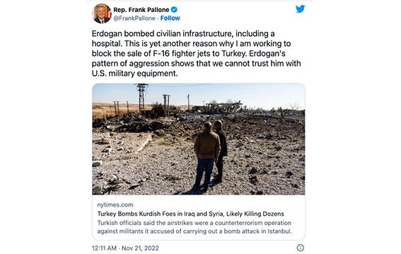 ÉTATS-UNIS – Frank Pallone : « Nous ne pouvons pas confier à la Turquie de l’armement américain »
