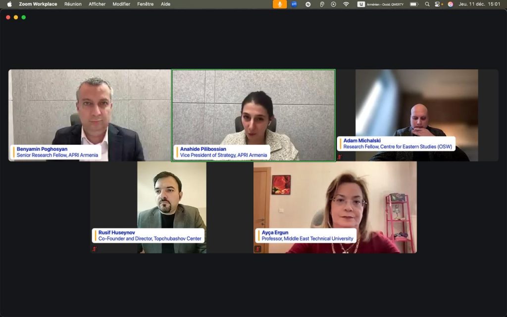 Le 11 décembre dernier, l’APRI Armenia (The Applied Policy Research Institute of Armenia) a organisé une conférence publique virtuelle sur la politique de la Turquie dans le Caucase du Sud. Cet événement visait à analyser le rôle évolutif de la Turquie dans la région et l’interaction complexe de ses intérêts. Modéré par Anahide Pilibossian, vice-présidente de la stratégie et du développement d’APRI Armenia, un panel de quatre spécialistes a pris part à cette conférence. Avant les débats, Benyamin Poghosyan, chercheur principal à l’APRI, a présenté son rapport de recherche intitulé « La politique de la Turquie dans le Caucase du Sud : efforts de normalisation au milieu de la politique “l’Azerbaïdjan d’abord” », qui analyse la place du Caucase du Sud dans la politique étrangère de la Turquie et évalue les relations de cette dernière avec la Russie, l’Iran, l’Azerbaïdjan, la Géorgie et l’Arménie. Le panel était composé de :