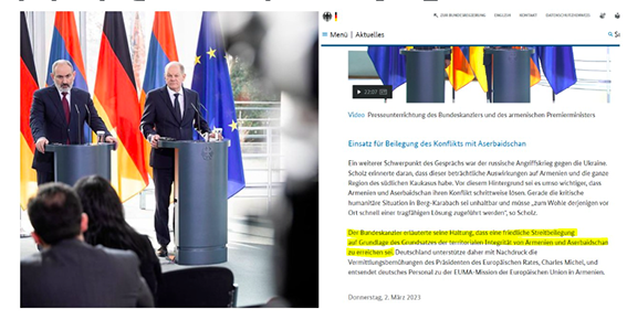 Concernant la conférence de presse avec Nikol Pachinian, selon la version actuelle du message publiée sur le site Internet, le Premier ministre allemand aurait (seulement) déclaré que « le règlement pacifique du conflit devrait être basé sur le principe de l’intégrité territoriale de l’Arménie et de l’Azerbaïdjan. »