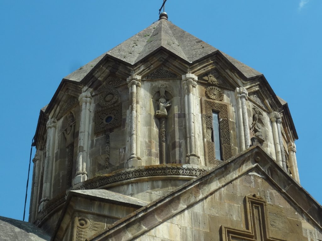 Il est difficile de décrire Gandzasar sans le support d’images. On parle à son sujet d’élégance et de raffinement. Gandzasar impressionne. On terminera ce compte-rendu par l’évocation de son tambour à 16 côtés, l’une des plus belles pièces de l’architecture arménienne en général, richement sculptée, dont l’originalité surprend, interroge même. Aux points cardinaux, sont figurés des sujets symboliquement importants. Le panneau ouest présente, sous le buste du Christ, la scène du péché originel. Sur les deux panneaux adjacents, deux personnages portent au-dessus de leur tête, sur une sorte de plateau, le modèle d’une église. Ils sont assis, à l’oriental, sur une colonne. Le panneau sud figure une mise au tombeau, Joseph d’Arimatie portant le corps du Christ. Sur les deux panneaux, deux personnages agenouillés sur une colonne, s’adressent au Christ en pose d’imploration. Ils sont surmontés d’un aigle à tête humaine. Quatre têtes d’animaux sont encastrées dans les niches : un bélier, un bœuf et deux aigles…
